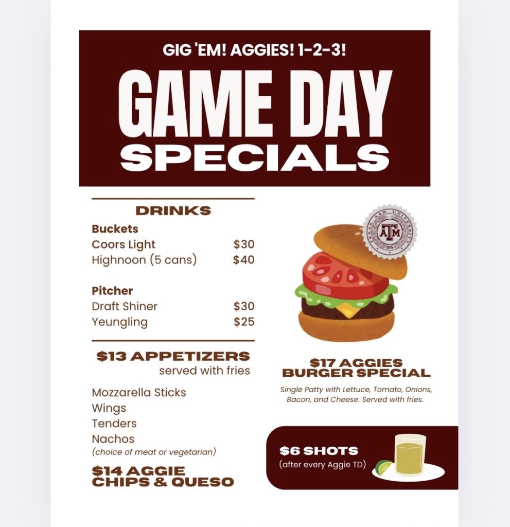 Not only will we have camaraderie and Aggie Football, we also have Game Day food and drink specials, we look forward to seeing you there!